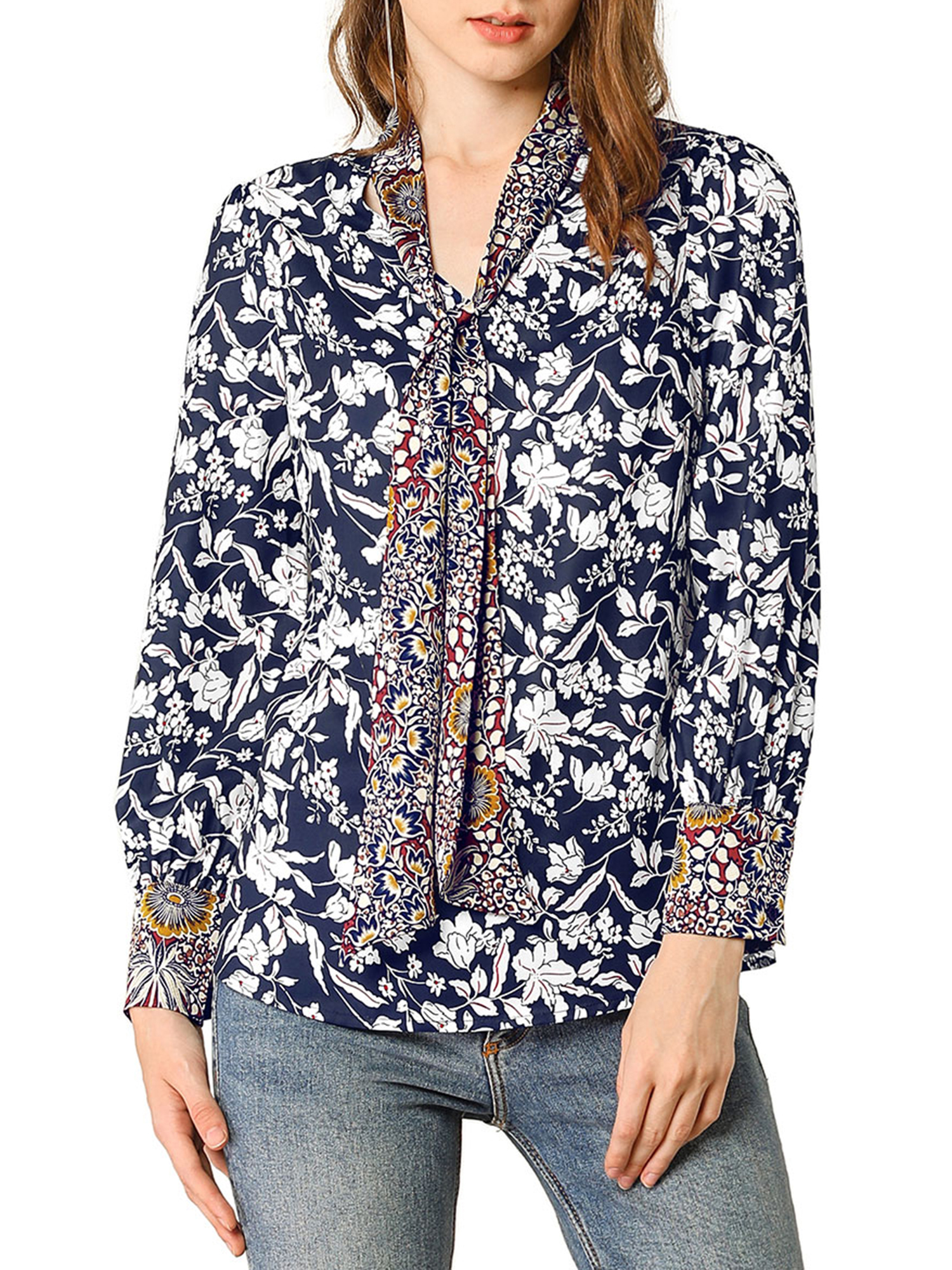 Unique Bargains Women S Boho Floral Printed Shirt V Neck Pussy Bow Blouse Walmart Com